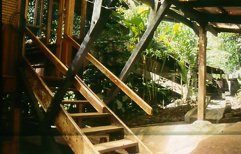 Eingangsbereich zur Station. Keine 'billige' Hütte, sondern solides 'Tropenholz' mit fliesendem Übergang in den Regenwald. Entrance to the station. No windy little hut but made of solid tropical wood with seamless transition to the rainforest.