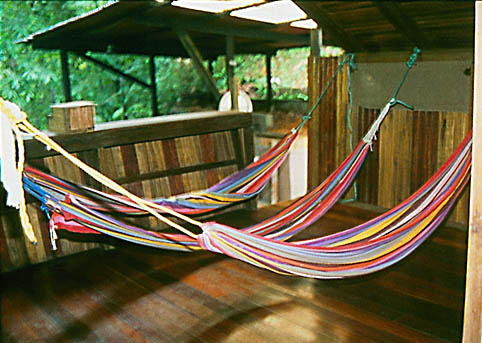 Ein paar Hängematten unterm Dach. Wer hart gearbeitet hat, freut sich auf ein paar Minuten relaxen in der Horizontalen. Die kleine Box im Hintergrund ist einer der unzähligen Bienenstöcke in der Station. A few hammocks beneath the roof. Having worked hard people really look forward to a few minutes chilling in a horizontal position. The small box in the back is one of the many bee hives at the station.