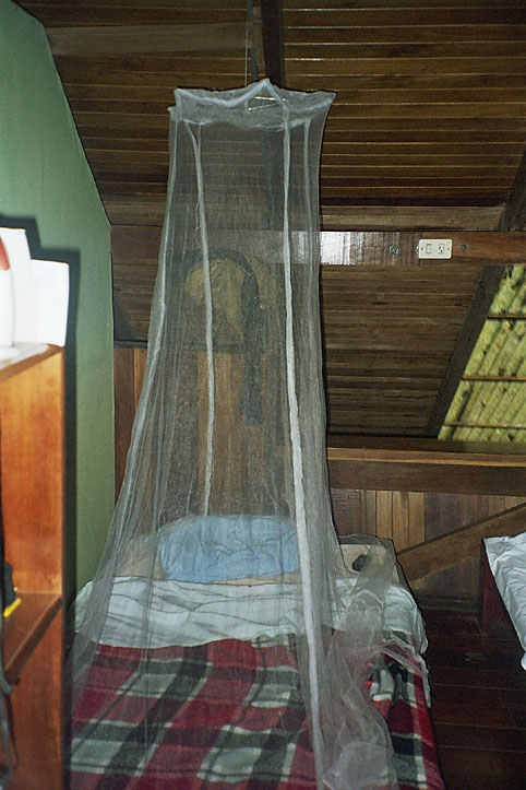 Das Bett eines übervorsichtigen Menschen. Bisher gibt es aufgrund der 'heilen' Waldstruktur um die Station kaum Moskitos. Ein Moskitonetz wird nicht gebraucht. Vorsichtige Menschen haben trotzdem eines mit dabei. Bettwäsche wird gestellt. That´s the bed of a cautious person. Up to now there´s hardly any mosquitoes at the station because of the healthy structure of the forest around. There´s no mosquito net needed. Cautious people still have one. Bedding is provided.
